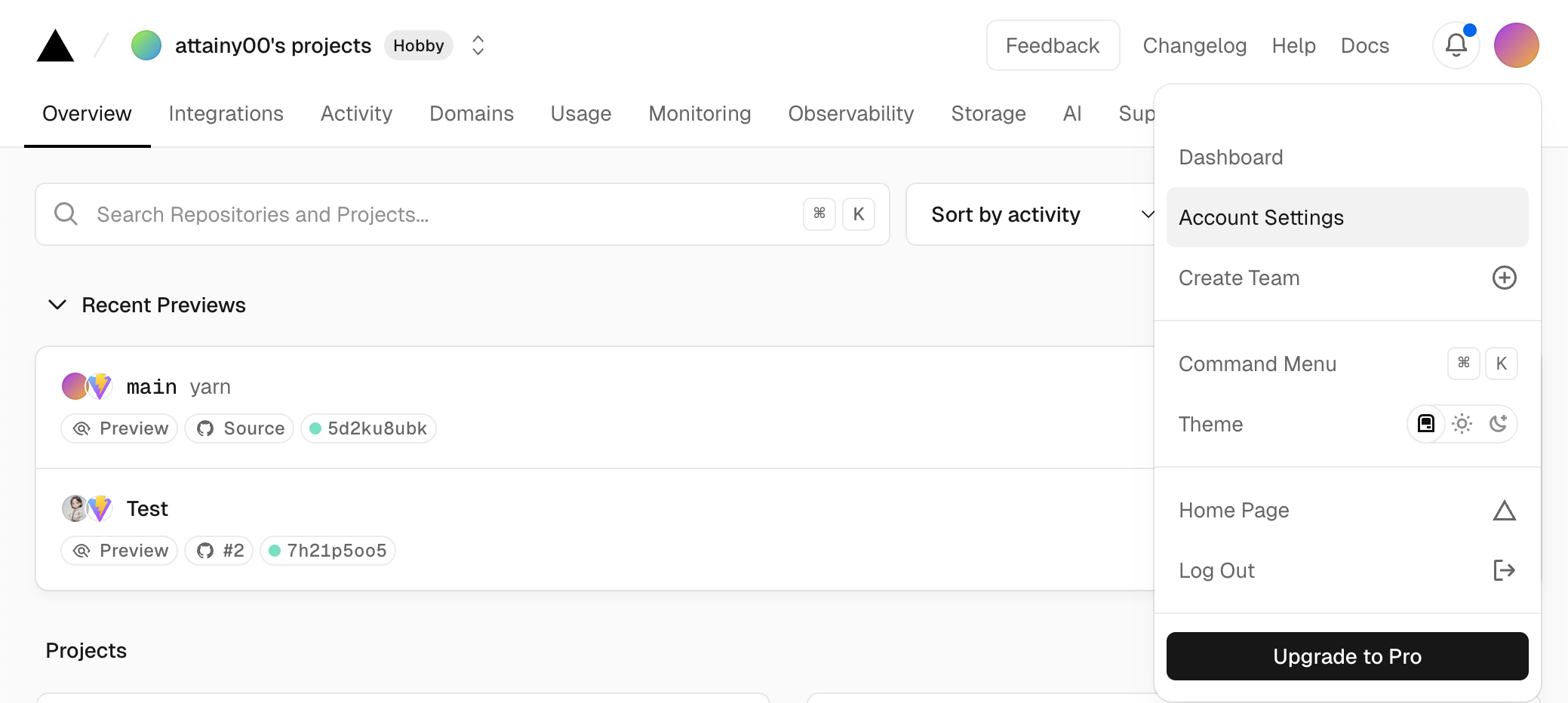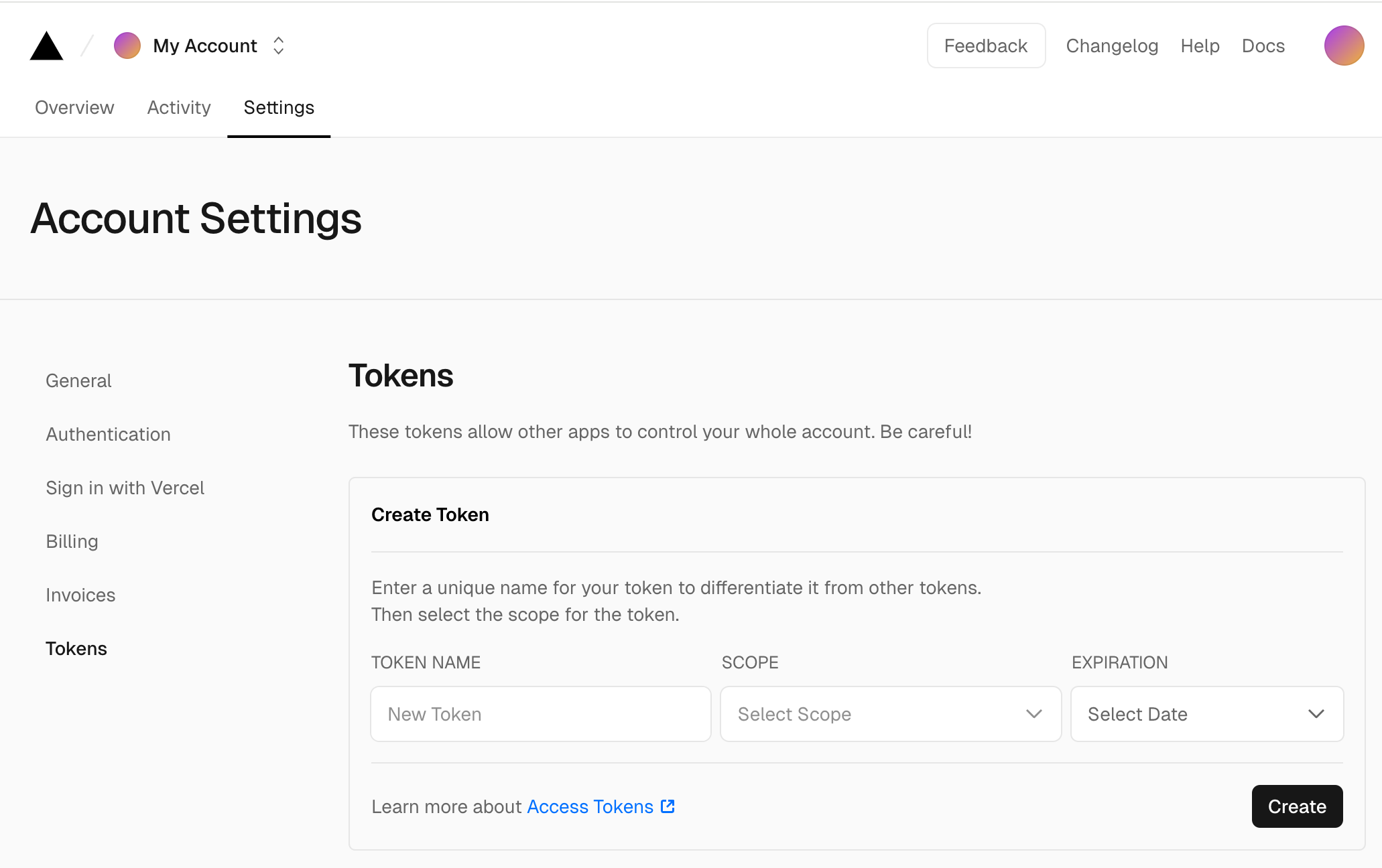 생성하는 위치는 vercel에서 프로필 사진을 클릭하면 Account Settings가 나온다.