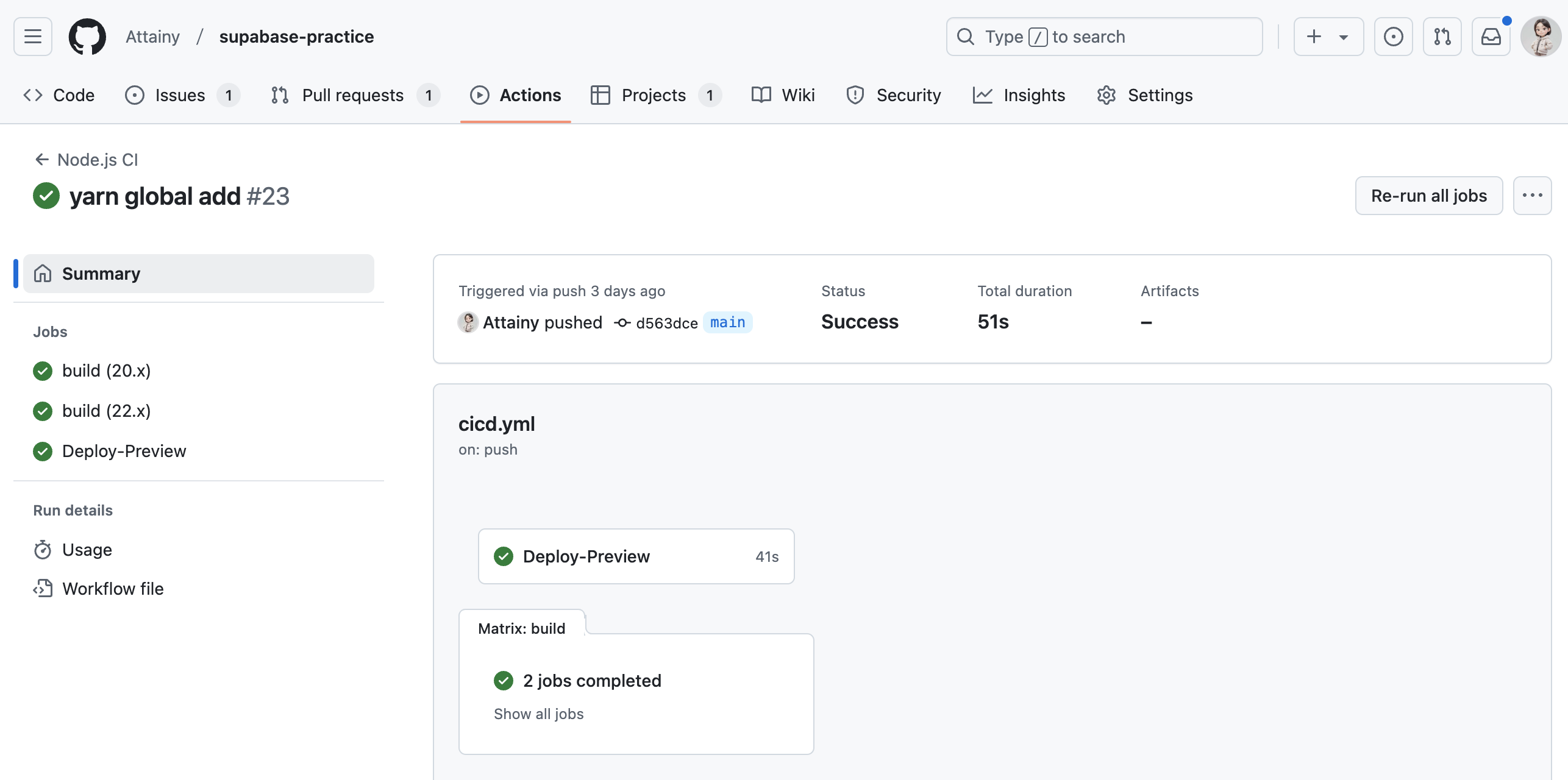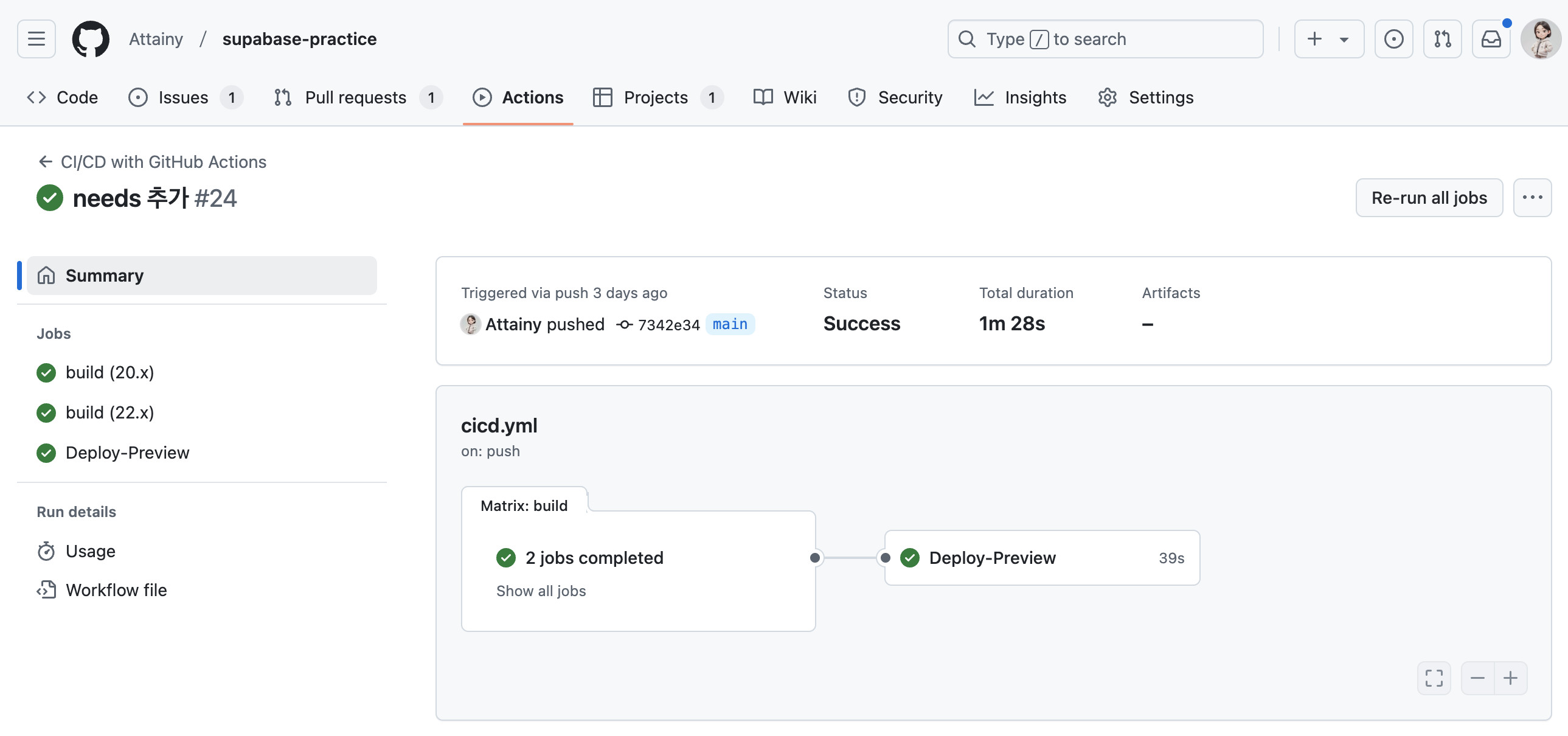 사실 이번 프로젝트에서 백엔드 부분까지 커버하기 위해 Supabase라는 서버리스 서비스를 사용하기 때문에 진정한 CI/CD 의미와는 조금 다르긴 하지만 그래도 의미있는 작업이었다.