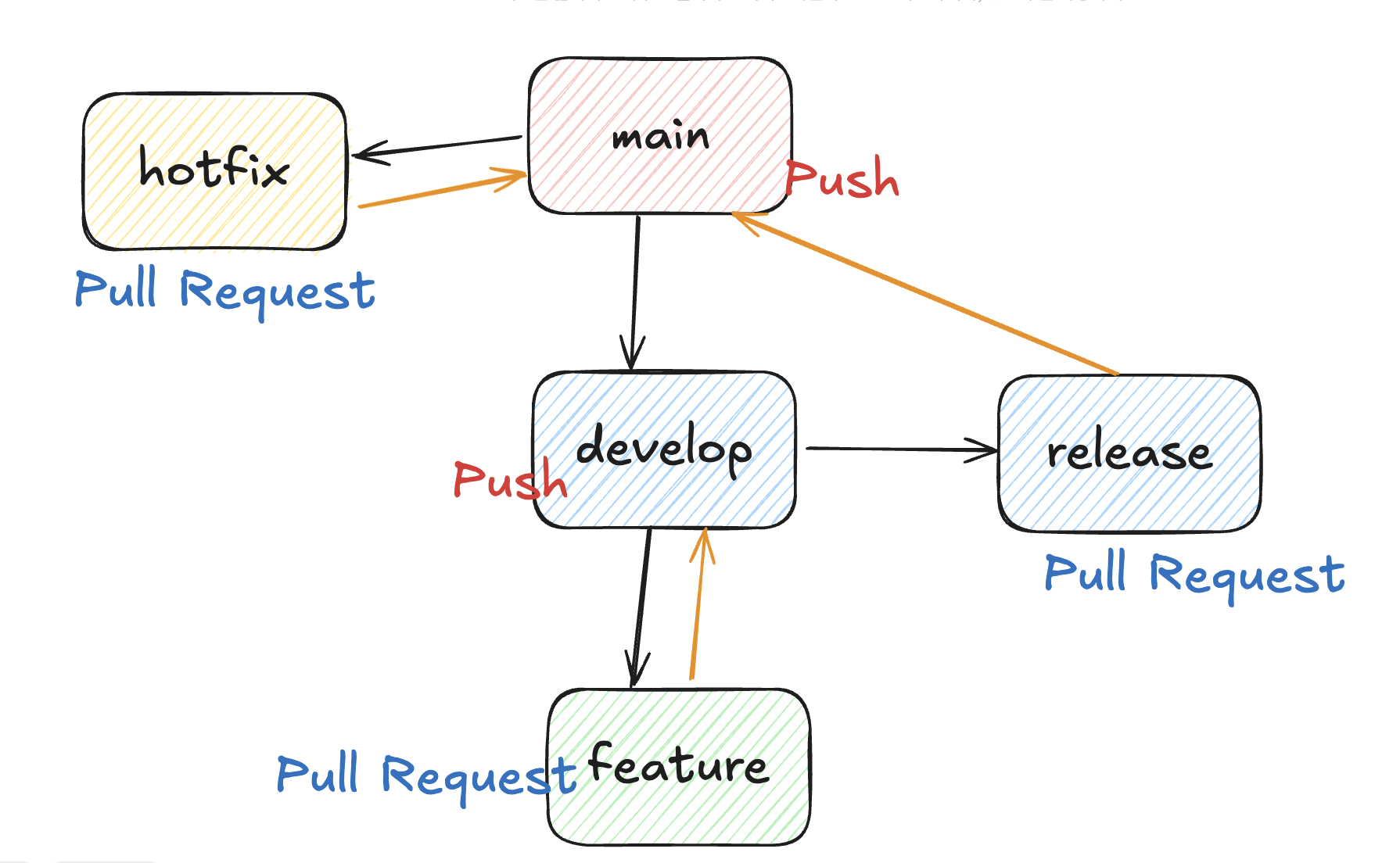우리는 Git Flow 브랜치 전략을 채택했기 때문에 main, develop, feature, release, hotfix 이렇게 5 종류의 브랜치를 사용하기로 했고 그림으로 표현해서 pull request가 필요한 부분과 push 이벤트가 필요한 부분을 생각해보았다.