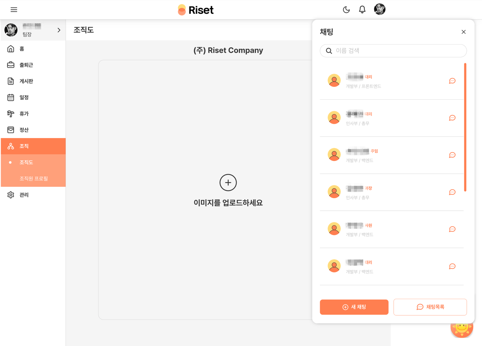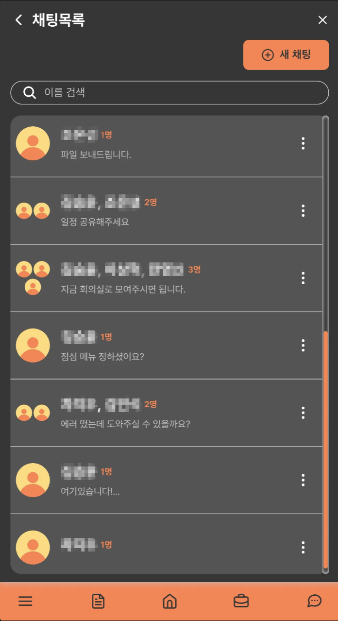 아래 사진처럼 직원들 목록 화면에서 이름을 검색할 수 있고 1명 또는 다수를 선택해서 채팅방을 만들 수 있다.