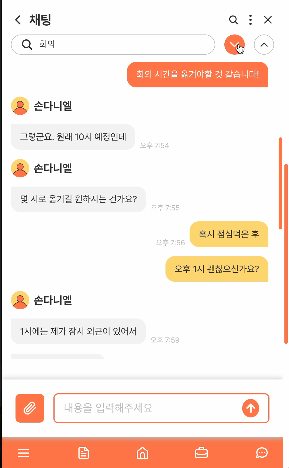 검색은 직원 이름 검색, 채팅방 목록 검색, 채팅 내용 검색 모두 구현했고, 텍스트 메시지와 파일도 전송할 수 있다.