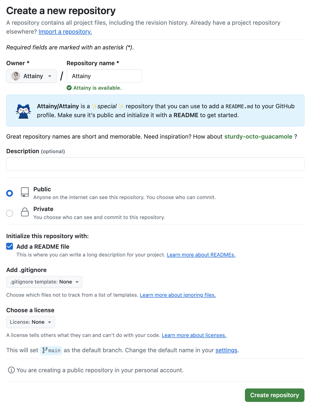 아래 사진처럼 이름을 똑같이 입력하면 "Special Repository"라는 귀여운 안내문이 뜬다.